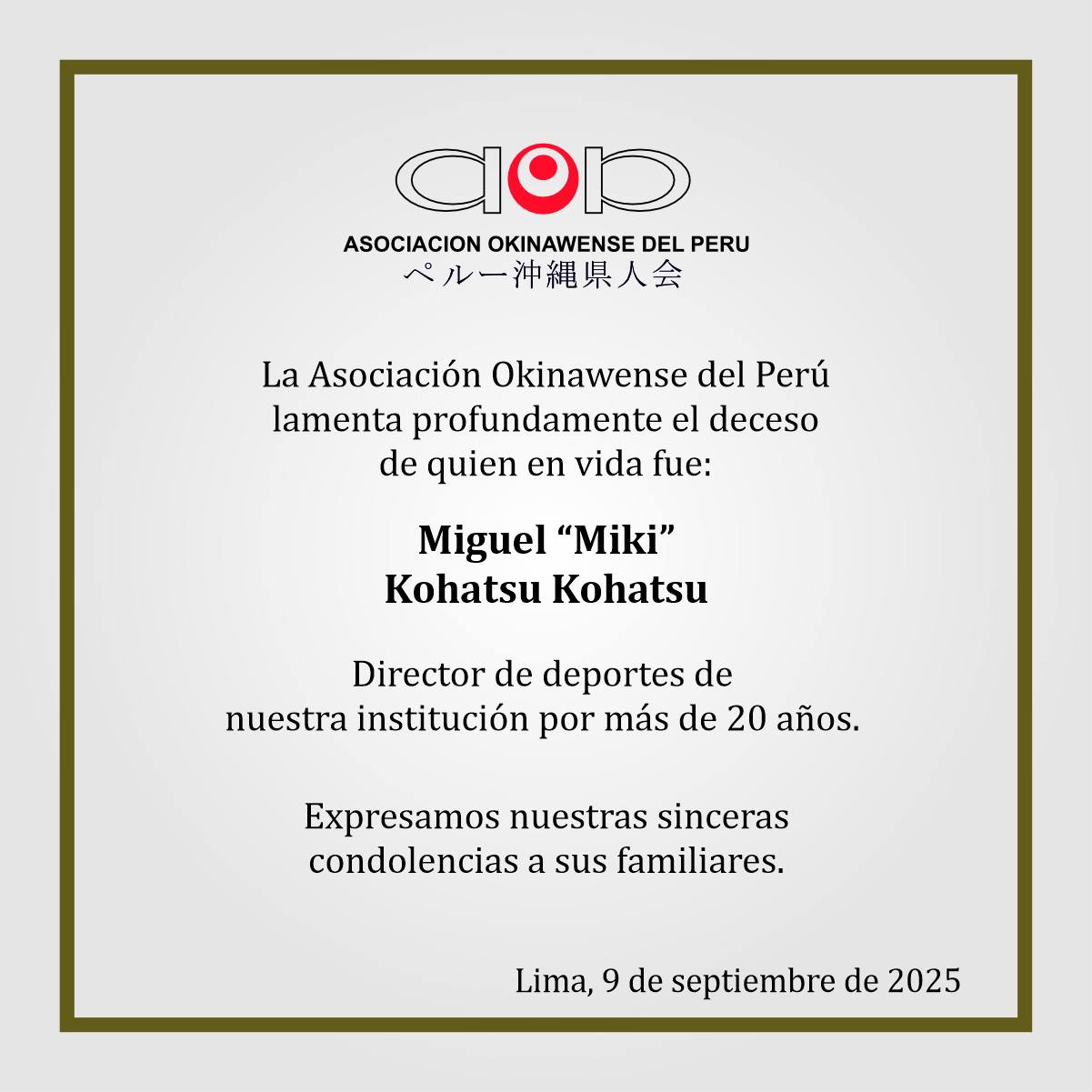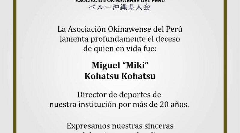 Asociación Okinawense del Perú La Asociación Okinawense del Perú 09/09/202510/09/2025 AOP Editor KZ 415 Views La Asociación Okinawense del Perú lamenta profundamente el deceso del señor Miguel Kohatsu Kohatsu, director de deportes de nuestra institución por más de 20 años. Expresamos nuestras sinceras condolencias a sus familiares. Q. E. P. D
