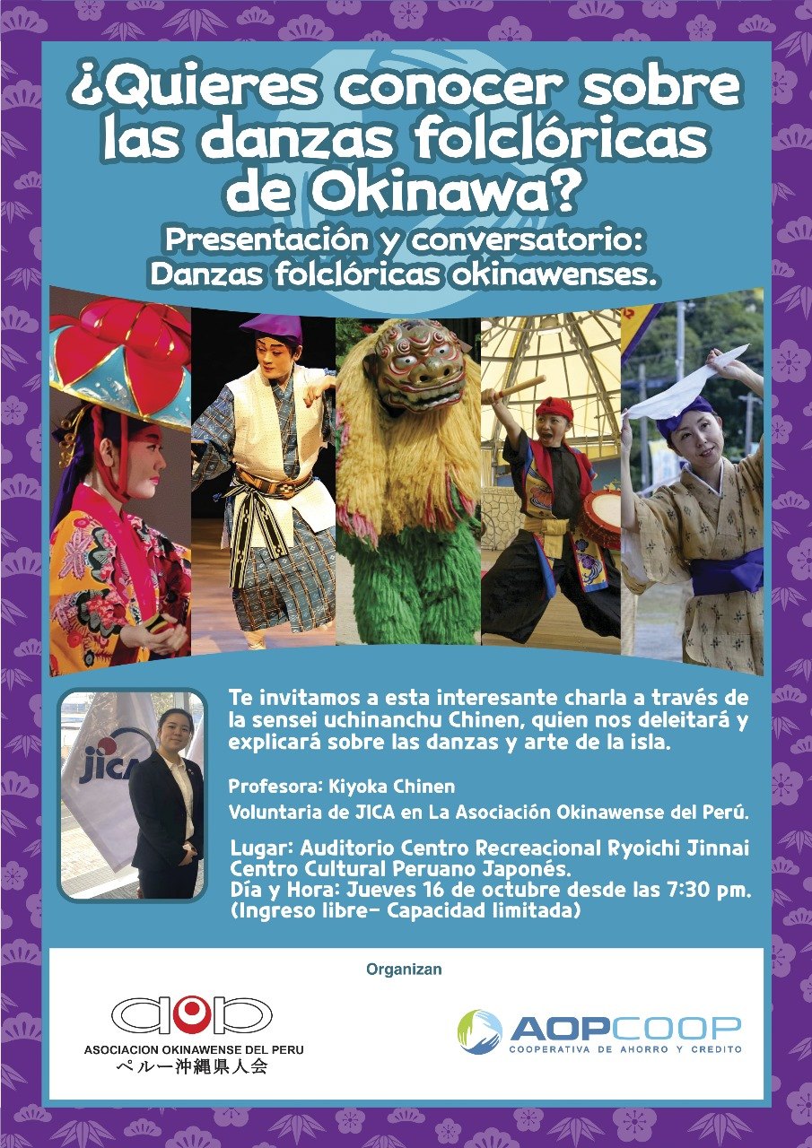ActividadesAsociación Okinawense del Perú ¡Sumérgete en las danzas folclóricas de Okinawa! 12/10/202513/10/2025 AOP Editor KZ 3 Views Acompáñanos en esta presentación especial con la sensei Kiyoka Chinen, voluntaria de JICA, quien compartirá el arte y movimiento de la danza okinawense. Jueves 16 de octubre – 7:30 p.m. Centro Cultural Peruano Japonés Ingreso libre (capacidad limitada)