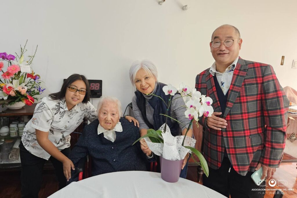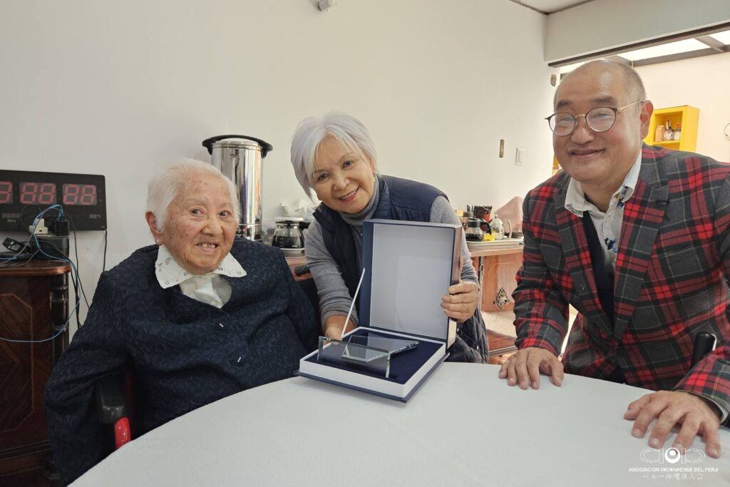 , quien a sus 100 años irradia salud, serenidad y una energía admirable. En nombre de la Asociación Okinawense del Perú, le hicimos entrega de una placa recordatoria y de agradecimiento como muestra de respeto y cariño por su ejemplo de vida.