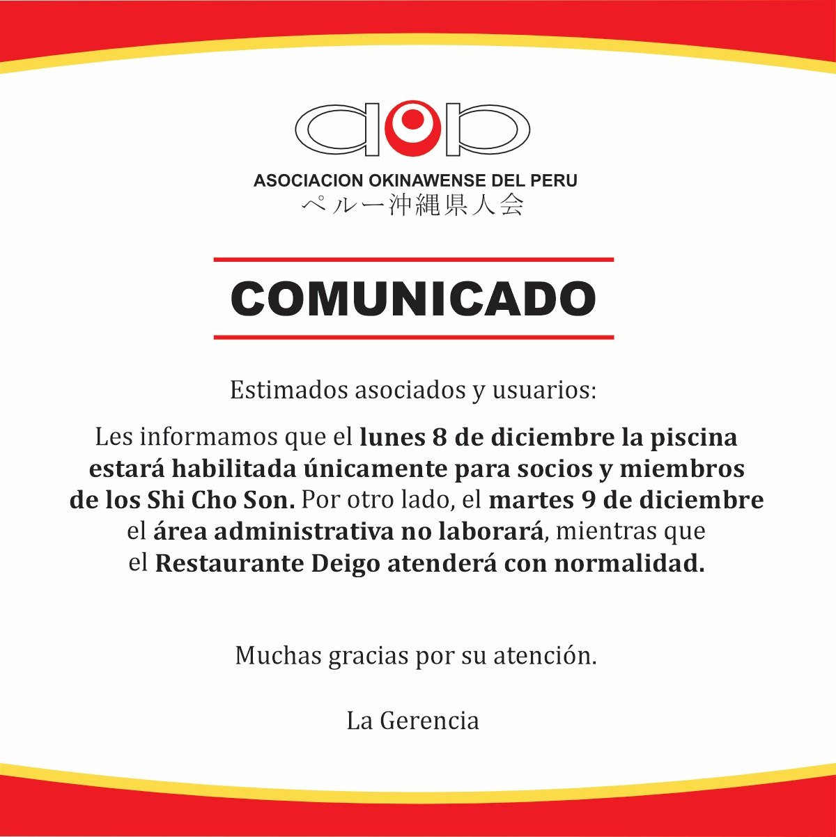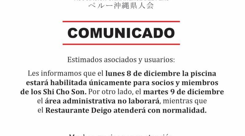 ActividadesAsociación Okinawense del Perú 𝗔𝗩𝗜𝗦𝗢 𝗜𝗠𝗣𝗢𝗥𝗧𝗔𝗡𝗧𝗘 04/12/202504/12/2025 AOP Editor KZ 20 Views 𝗟𝘂𝗻𝗲𝘀 𝟴 𝗱𝗲 𝗱𝗶𝗰𝗶𝗲𝗺𝗯𝗿𝗲 Piscina solo para socios y miembros de los Shi Cho Son 𝗠𝗮𝗿𝘁𝗲𝘀 𝟵 𝗱𝗲 𝗱𝗶𝗰𝗶𝗲𝗺𝗯𝗿𝗲 Área administrativa no laborará Restaurante Deigo sí estará abierto