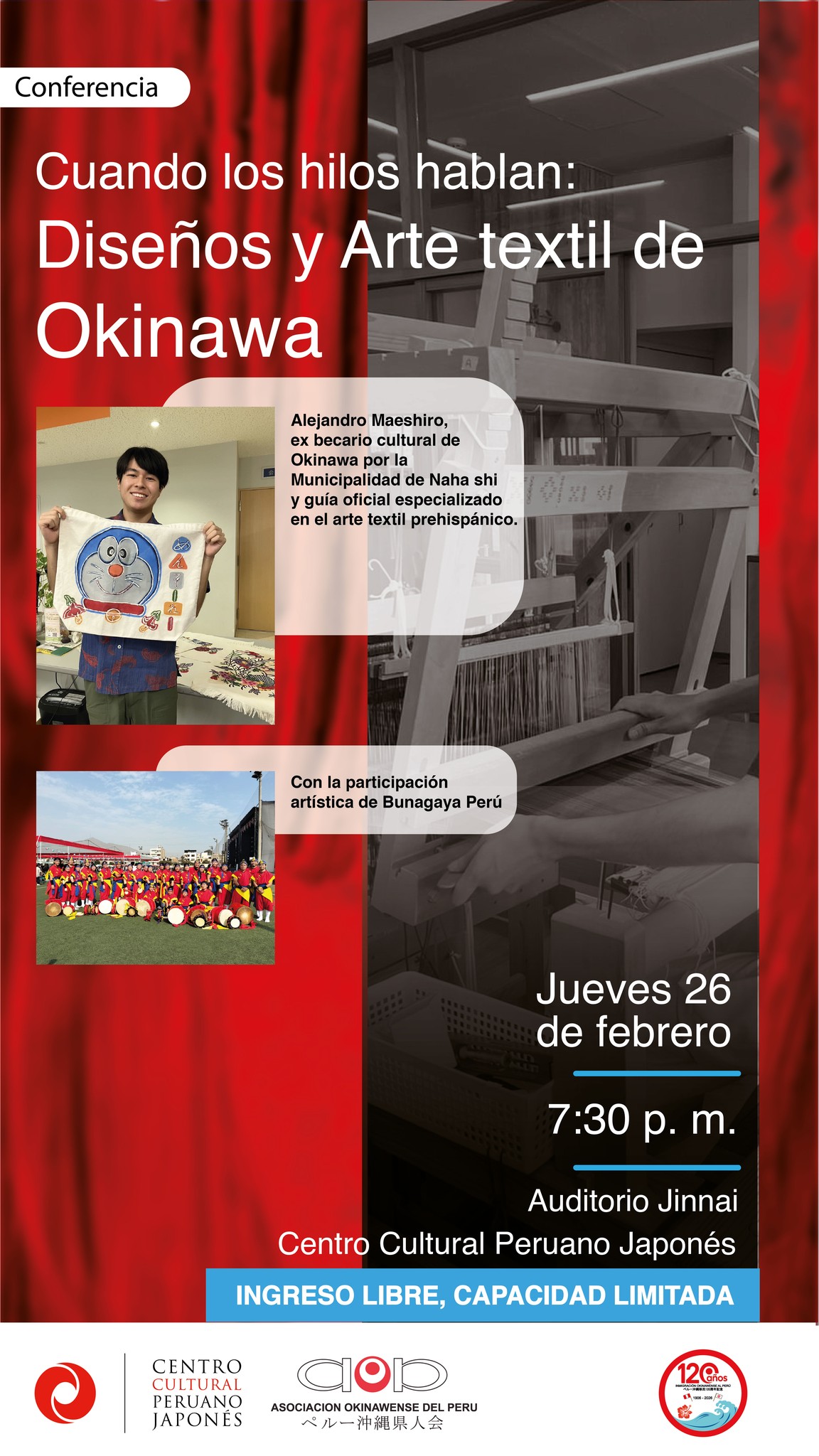 Con la participación de Alejandro Maeshiro, ex becario cultural de Okinawa por la Municipalidad de Naha shi y guía oficial especializado en arte textil prehispánico.