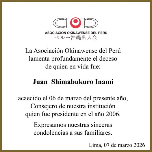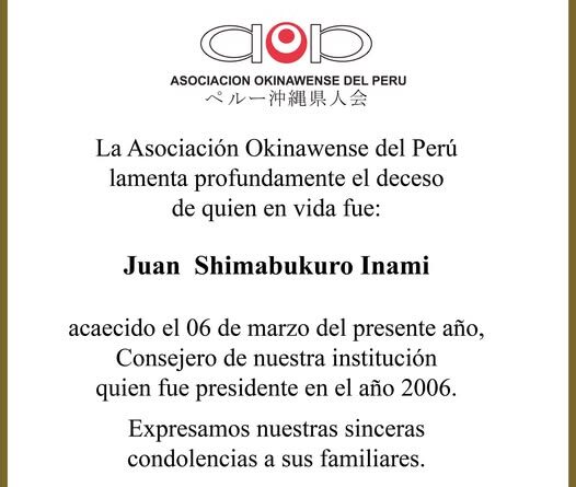 La Asociación Okinawense del Perú lamenta profundamente el deceso del señor Juan Shimabukuro Inami,