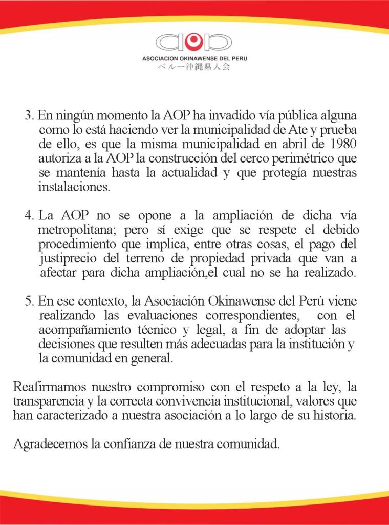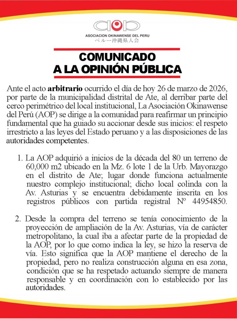 ActividadesAsociación Okinawense del PerúTalleres Comunicado sobre la intervención arbitraria de la Municipalidad de Ate en nuestro cerco perimetral de la Av. Asturias. 26/03/202626/03/2026 AOP Editor KZ 3 Views